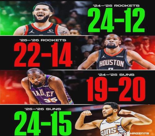 太陽24勝15負(fù)西部第六升至季后賽區(qū)域,火箭22勝14負(fù)掉入附加賽區(qū)域。
