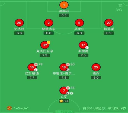 卡里克首段任期的最后一場比賽是2021/2022賽季英超第14輪主場迎戰(zhàn)阿森納。那場比賽,卡里克排出了4-2-3-1的陣型。首發(fā)門將是德赫亞,四名后衛(wèi)分別是特萊斯、馬奎爾、林德洛夫、達(dá)洛特,中場弗雷德、麥克托米奈、B費,拉什福德和桑喬分居兩翼,單前鋒是C羅。那場比賽,C羅雙響,B費破門,曼聯(lián)主場3-2戰(zhàn)勝阿森納。