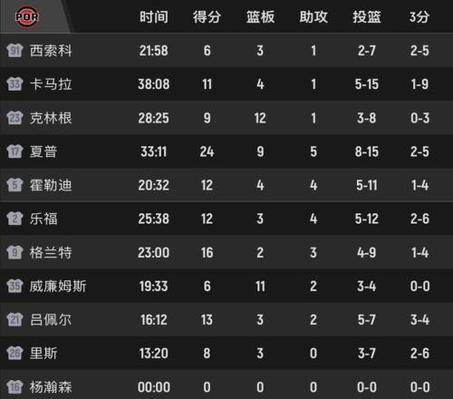 來看下本場數(shù)據(jù):夏普24分9板5助攻,格蘭特16分,霍勒迪12分4板4助,克林根9分12板,羅威6分11板,里斯8分3板。老鷹的麥科勒姆20分3板4助,奧孔武26分9板2助,約翰遜12分11板6助,沃克11分6板7助。楊瀚森昨日表現(xiàn)那么好,本場無緣出場,卡馬拉15投5中,三分9中1,鐵成這樣,僅得11分,卻能上場38分鐘,斯普利特的用人遭到質(zhì)疑。