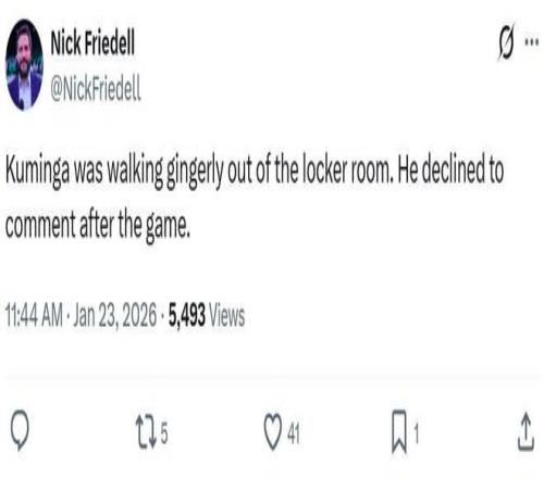結(jié)果本場(chǎng)庫(kù)明加又半場(chǎng)傷退,賽后勇士記者Nick Friedell透露,庫(kù)明加一瘸一拐離開(kāi)球館,并且拒絕了采訪,科爾表示庫(kù)明加將接受核磁共振檢查。