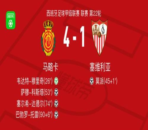 北京時(shí)間2月3日西班牙足球甲級(jí)聯(lián)賽 聯(lián)賽 第22輪,馬略卡主場對(duì)陣塞維利亞。馬略卡韋達(dá)特-穆里奇破門,薩穆-科斯塔破門,塞爾希-達(dá)德爾破門,巴勃羅-托雷破門。塞維利亞莫派破門。最終比分馬略卡 4-1 塞維利亞。