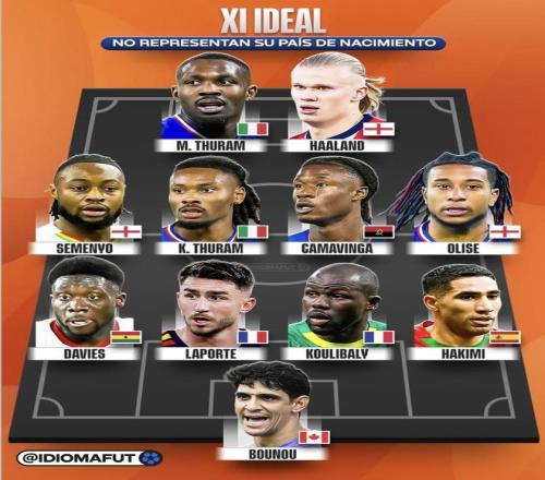 最近Idiomafut發(fā)布了“不代表出生國的最佳陣容”。哈蘭德、圖拉姆、奧利塞、卡馬文加、戴維斯、拉波爾特、庫利巴利、哈基米和布努入選。名單里最大的反差,是他們的出生國和代表國家隊(duì)對不上,英格蘭、意大利、法國、加拿大這些出生地和最終選擇的國家隊(duì)形成了明顯錯(cuò)位。把這11個(gè)人按位置拼成一套首發(fā),這套陣容的整體實(shí)力到底能到什么檔次?
