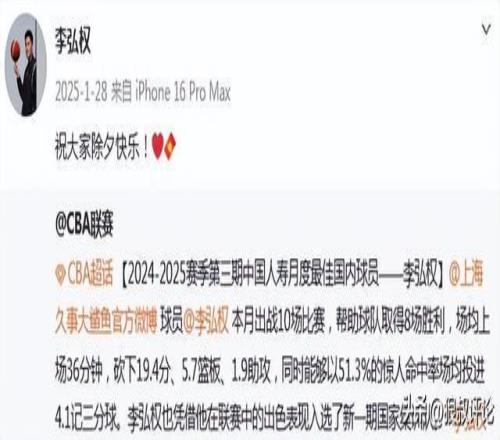 2025年1月,李弘權(quán)憑借12月的月度最佳表現(xiàn),代表上海出戰(zhàn)10場比賽,取得8勝2負(fù)的戰(zhàn)績,場均上場36分鐘,砍下19.4分、5.7籃板、1.9助攻,同時能夠以51.3%的驚人命中率場均投進(jìn)4.1記三分球。李弘權(quán)也憑借他在聯(lián)賽中的出色表現(xiàn)入選了新一期國家集訓(xùn)隊(duì)。