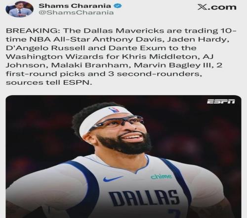 爆料王Shams:獨行俠將濃眉哥+拉塞爾+哈迪+??怂_姆送至奇才,換回米德爾頓+AJ-約翰遜+布蘭納德+巴格利+2個首輪簽+3個次輪簽。