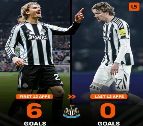 據(jù)統(tǒng)計(jì),沃爾特馬德在代表紐卡斯?fàn)柭?lián)的前12場(chǎng)比賽中打進(jìn)6球,但在過(guò)去的12場(chǎng)比賽中,他顆粒無(wú)收。他上一次進(jìn)球還是在英超第17輪對(duì)切爾西的比賽中上演的梅開(kāi)二度。