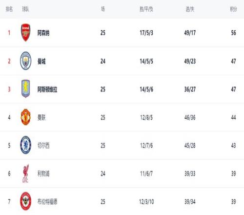 在積分榜上,阿森納以56分排名榜首。曼城少賽一輪,依然是47分,排名第2。阿斯頓維拉只拿到一場平局,總積分也是47分,排名第3。阿森納的領(lǐng)先優(yōu)勢足足有9分,讓冠軍懸念越來越小。曼聯(lián)不斷贏球,總積分已經(jīng)達(dá)到44分,排名第4。切爾西以43分排名第5。利物浦39分排名第6。