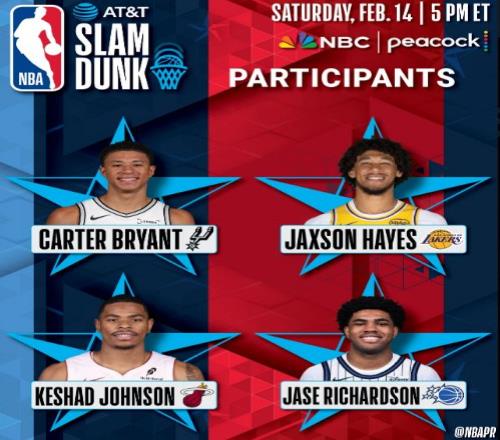 魔術(shù)新秀、兩屆扣籃王杰森-理查德森之子賈斯-理查德森,頂替?zhèn)说亩艂悈⒓涌刍@大賽,其余3位參賽選手是湖人中鋒海斯,以及熱火前鋒凱沙德-約翰遜與馬刺新秀布萊恩特。