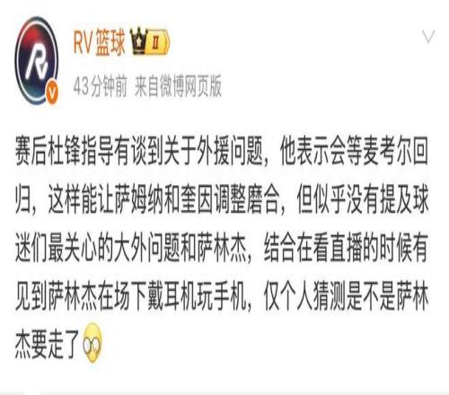 關(guān)于薩林杰的去留問題,杜鋒并沒有談,不過有媒體爆料,廣東宏遠可能會裁掉薩林杰。