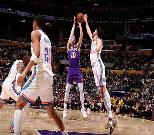 本場比賽中,在交易截止日前剛剛從亞特蘭大老鷹加盟湖人的替補后場新援盧克-肯納德(Luke Kennard)的表現(xiàn)還算是中規(guī)中矩。肯納德全場出場24分13秒,投籃5中3,三分線外2中1,得到了7分1籃板1助攻1搶斷的數(shù)據(jù),還有4次犯規(guī),正負值為-7。其實從表現(xiàn)來看,肯納德的整體狀態(tài)還是不錯的,他在進攻端還是展現(xiàn)出了自己全面的得分能力,他的手感看起來也是不錯的。問題就在于,肯納德完全沒有辦法得到更多的出手機會,這種情況下他在進攻端的威力,特別是他的投射能力,也沒有辦法發(fā)揮出來??霞{德本來就是一名攻強于守的球員,指望他在其他方面起到更大的作用顯然也是一件不太現(xiàn)實的事情。很顯然,湖人還是沒有開發(fā)出肯納德的最大價值,他的功能并沒有體現(xiàn)出來。