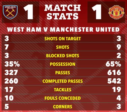 努諾·桑托的西漢姆采用541陣型密集防守,曼聯(lián)掌控球權(quán),但似乎不知道如何是好,高達(dá)65%的控球率,卡里克的球隊只轉(zhuǎn)化為3次有效射門。
