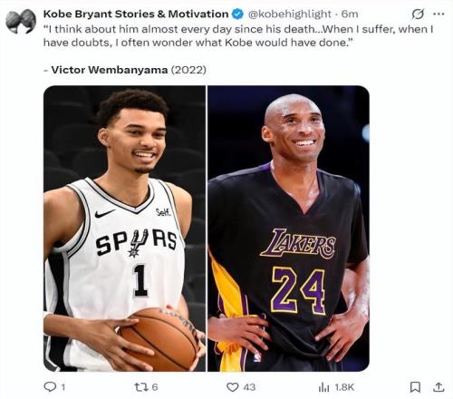 科比的球迷組織回憶了文班亞馬2022年悼念科比的言論:自從科比去世后我?guī)缀趺刻於紩肫鹚.斘以庥隼щy、產(chǎn)生疑慮時我經(jīng)常會思考科比是怎么去做的。