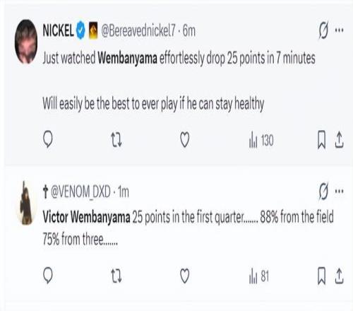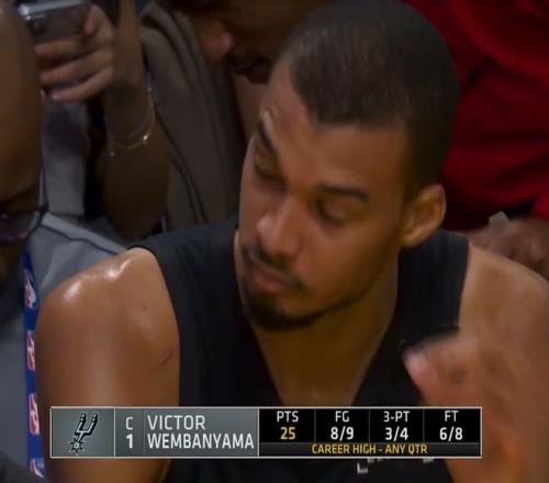 美球迷:文班亞馬這是要打破張伯倫單場100分的紀錄嗎?(8分鐘25分,那么16分鐘就是50分,24分鐘就是75分,32分鐘就是100!當然這是一種夸張的說法,文班亞馬要打破單場100分的紀錄還是很難)