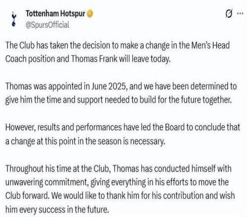 北京時間2月11日傍晚18點20分,熱刺官方發(fā)布公告:托馬斯·弗蘭克不再擔(dān)任一線隊主帥,即刻生效。距離球隊1-2輸給紐卡斯?fàn)枺瑑H僅過去12個小時。這樣一來,52歲的弗蘭克,就這樣成為本賽季英超第7位正式下課的主帥。前6人分別是:9月,諾丁漢森林解雇努諾,西漢姆送走波特;10月,波斯特科格魯離開森林;11月,狼隊與佩雷拉分道揚鑣;1月,切爾西的馬雷斯卡、曼聯(lián)的阿莫林相繼下課。