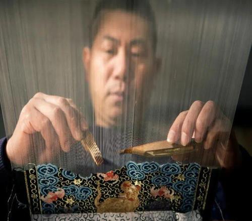 △非遺技藝“緙絲”的傳承人王建江在織造作品