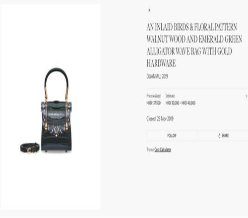 2019年,佳士得拍賣(mài)行拍出了一只端木良錦的迷你細(xì)木鑲嵌手袋,預(yù)估價(jià)2-3萬(wàn),最終以13.75萬(wàn)港元成交,讓這個(gè)牌子在小范圍內(nèi)一戰(zhàn)成名,被稱為“中國(guó)的奢侈品牌”。