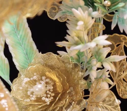 指的是把金、銀等貴金屬“拉”成細(xì)到頭發(fā)級(jí)別的絲,再用各種獨(dú)門(mén)手法,把金屬絲做成紋樣與立體結(jié)構(gòu),結(jié)合寶石珍珠鑲嵌完成作品。