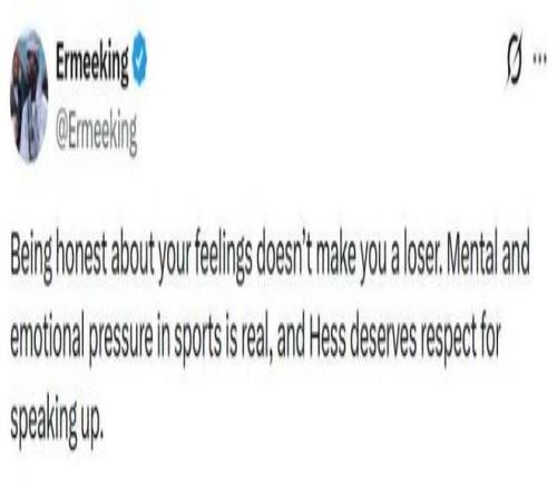 還有網(wǎng)友對赫斯表示支持,“坦誠表達自己的感受并不代表你是個失敗者。體育運動中的心理和情感壓力是真實存在的,赫斯敢于發(fā)聲值得尊重?!薄?/p>